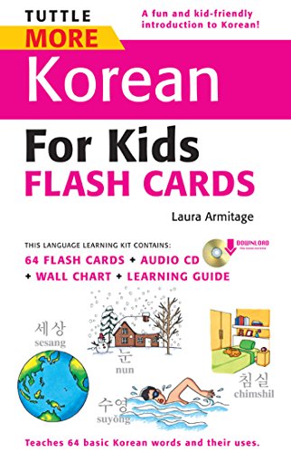 The Tuttle MORE Korean for Kids Flash Cards kit is an introductory Korean language learning tool especially designed to help children from preschool through early elementary level acquire basic words, hangul script, phrases, and sentences in Korean in a fun and easy way.